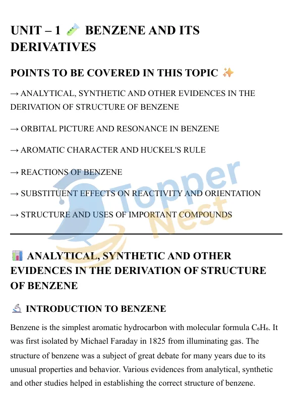 Benzene was first discovered by Michael Faraday in 1825, but its true structure puzzled chemists for decades. Experimental observations revealed that benzene (C₆H₆) had a high degree of unsaturation but did not behave like ordinary alkenes. Despite having double bonds on paper, it resisted addition reactions — a mystery that could only be explained through deeper structural analysis.