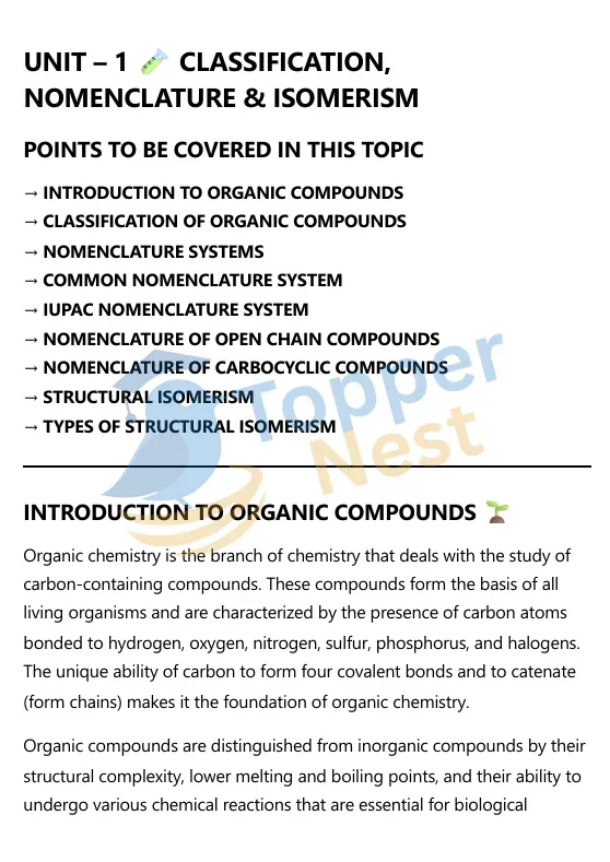 This unit introduces three important aspects: classification of organic compounds, rules of nomenclature (common and IUPAC systems), and structural isomerism. Together, these concepts provide the foundation for all further studies in organic chemistry.