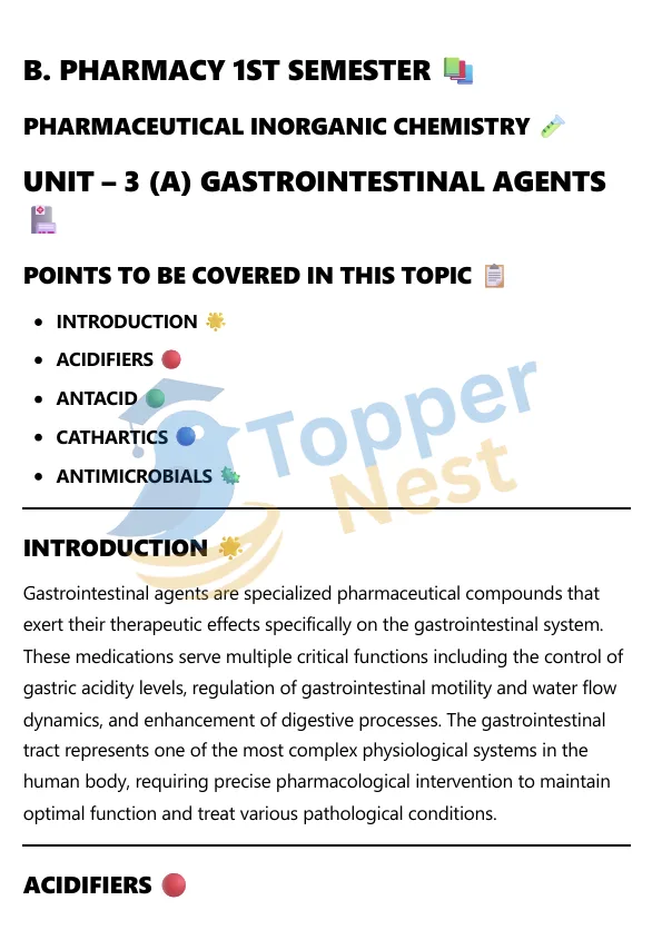 Gastrointestinal (GI) agents play a crucial role in treating various stomach and intestinal disorders. This unit introduces commonly used acidifiers, antacids, and cathartics, explaining their roles, ideal properties, and examples used in pharmacy.