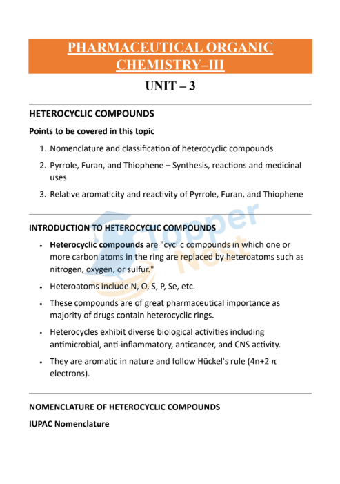 UNIT 3 focuses on three classic five-membered heterocycles: pyrrole, furan, and thiophene. Despite their small size, these compounds display remarkable aromatic stability, unique reactivity, and huge medicinal value. Understanding their chemistry helps students connect organic theory with real-world drug design.