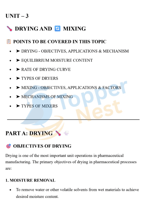 In pharmaceutical factories, two quiet yet powerful operations determine the quality of tablets, capsules, and suspensions: drying and mixing. Excess moisture can spoil drugs, while poor mixing leads to uneven dosage. UNIT 3 focuses on these core engineering processes, showing how controlled moisture removal and uniform blending ensure safety, stability, and therapeutic accuracy.