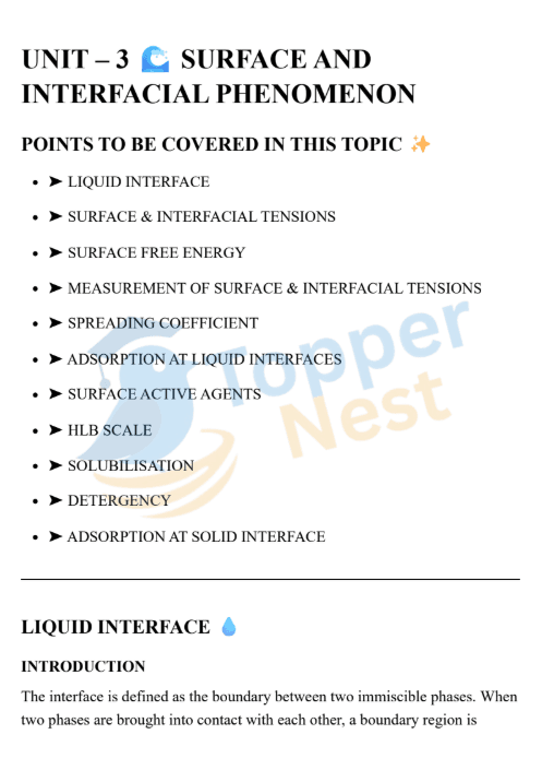 In pharmaceutical science, some of the most important reactions occur not in the bulk of a solution, but at surfaces and interfaces. From emulsions in syrups to creams, suspensions, and detergents, the behavior of molecules at boundaries determines stability, solubility, and effectiveness. UNIT 3 introduces the science of surface and interfacial phenomena, a key topic connecting physical chemistry with real-world drug formulation.