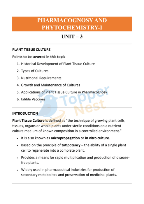 What began as a botanical experiment has now become a key technology in pharmacognosy, enabling large-scale production of medicinal compounds, conservation of rare plants, and even development of edible vaccines. UNIT 3 explores this fascinating blend of biotechnology and pharmacy.