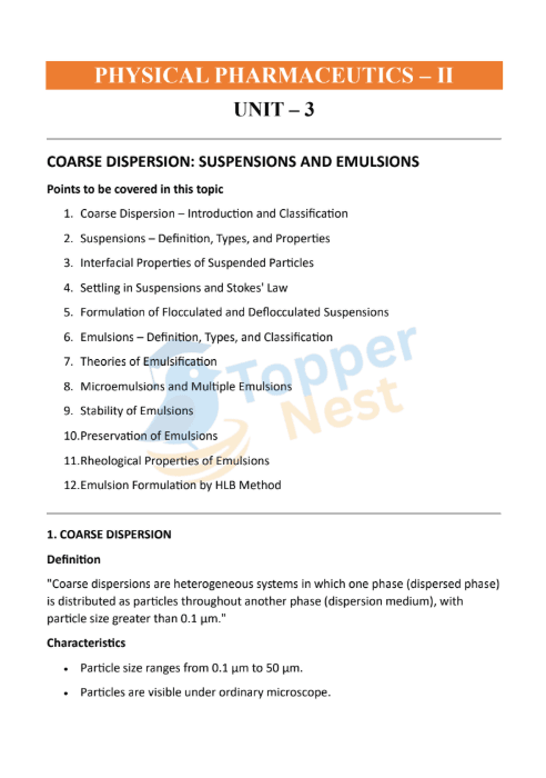 Unlike true solutions, coarse dispersions need careful formulation to stay stable and effective. UNIT 3 dives into the science of suspensions and emulsions, explaining how pharmaceutical scientists design these products to ensure uniform dosing, long shelf life, and patient convenience.