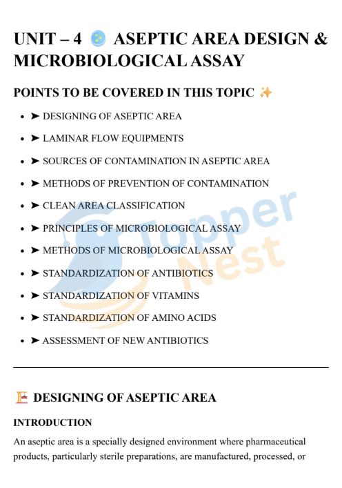 Behind every sterile injection, vaccine, or ophthalmic solution lies a carefully controlled environment known as the aseptic area. Here, even a single microorganism can compromise an entire batch of medicine. UNIT 4 focuses on the science of contamination control, cleanroom technology, and microbiological assays—tools that ensure drug safety and potency.