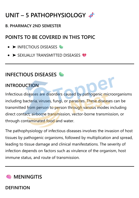 Infectious diseases remain one of the major challenges to global health. They can affect almost every organ system and are caused by bacteria, viruses, fungi, or parasites. This unit focuses on central nervous system infections, systemic bacterial diseases, urinary tract infections, and sexually transmitted diseases (STDs).
