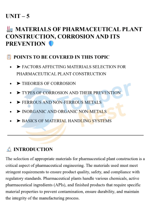 Unit 5 – Pharmaceutical Plant Construction & Corrosion Notes